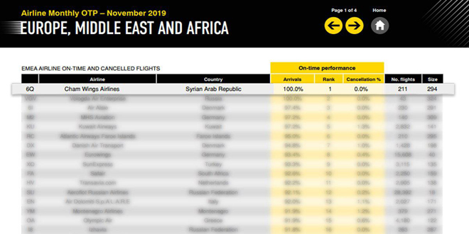 أحرزت شركة أجنحة الشام للطيران المركز الأول بدقة مواعيد رحلاتها الجوية عن شهر تشرين الثاني لعام 2019 حسب ما أفاد به مؤشر “أو تي بي” العالمي الصادر عن شركة “أو أي جي” الأولى عالمياً بنشر جداول مواعيد رحلات جميع شركات الطيران بالعالم.