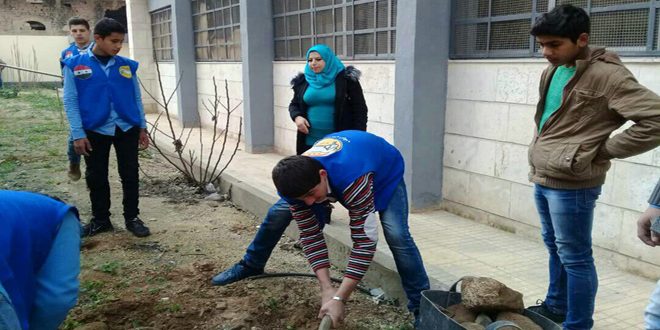 نظم فرع منظمة اتحاد شبيبة الثورة في حمص أسبوعا تطوعيا لإعادة تأهيل الحدائق والباحات الترابية في مدرستي خالد بن الوليد وسعيد العاص اللتين تعرضتا للتخريب من قبل المجموعات الإرهابية المسلحة وذلك انطلاقا من شعار المنظمة متطوعون لأجل الوطن.