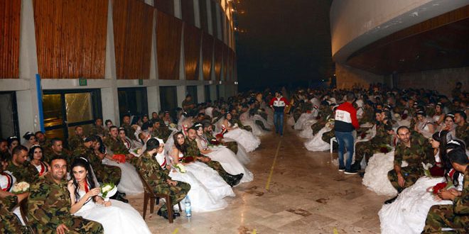 أضخم عرس جماعي لأبطال الجيش والدفاع الشعبي في اللاذقية- صور وفيديو