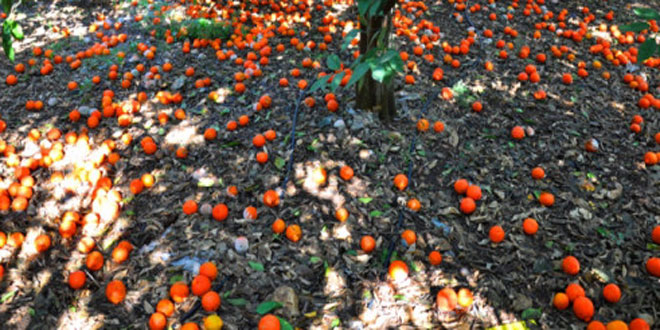 أدت العاصفة المطرية التي شهدتها محافظة اللاذقية خلال الفترة الممتدة من الـ 16 إلى الـ 20 من الشهر الجاري إلى تساقط بعض أصناف الحمضيات المتبقية على الشجر “كلمنتينا وأبو صرة”.