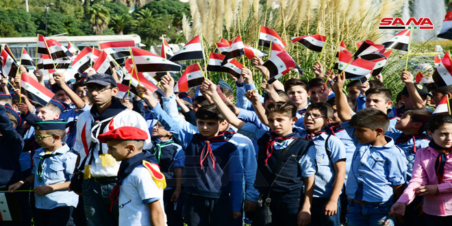 وفي ساحة سعد الله الجابري بحلب أدى أطفال المنظمة تحية العلم معبرين عن اعتزازهم برمز وطنهم فيما أكد أمين فرع المنظمة موسى الأحمد أن الفعالية تؤكد التزام المنظمات الشعبية بالنهج الوطني.