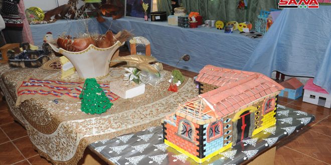 أعمال فنية مصنوعة من توالف ومخلفات البيئة نفذتها طالبات ثانوية بنات المحطة بدرعا ضمن معرض فني منوع في صالة المدرسة.