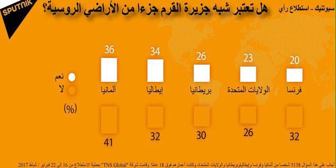 وأشارت الاستطلاعات التي أجرتها وكالة سبوتنيك الروسية إلى أن ربع البريطانيين تقريبا أي 26 بالمئة و23 بالمئة من الأمريكيين و20 بالمئة من الفرنسيين لديهم الاعتقاد نفسه بخصوص شبه جزيرة القرم.