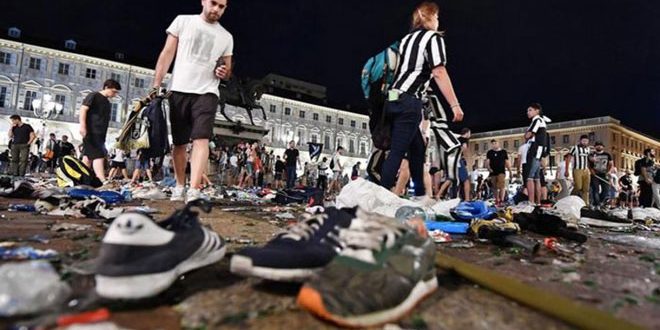 أصيب نحو ألف شخص بجروح خلال تدافع نجم عن حالة هلع بين الحشد الذي تجمع مساء أمس في ساحة وسط تورينو لمتابعة المباراة النهائية لدوري أبطال أوروبا وفقا لما أعلنته الشرطة الإيطالية اليوم.