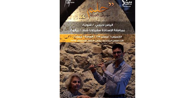 في دعوة للأمل والتشبث بالحلم والحب تنظم صالة الآرت هاوس بدمشق أمسية موسيقية عند الساعة السادسة من مساء يوم غد الخميس بعنوان “حلم” تجمع بين “الفلوت والبيانو” بالتعاون مع مشروع “لاقونا على الطريق” يحييها عازف الفلوت الياس جرجي وترافقه على البيانو سفيتلانا شطا.