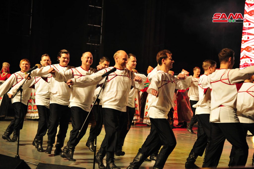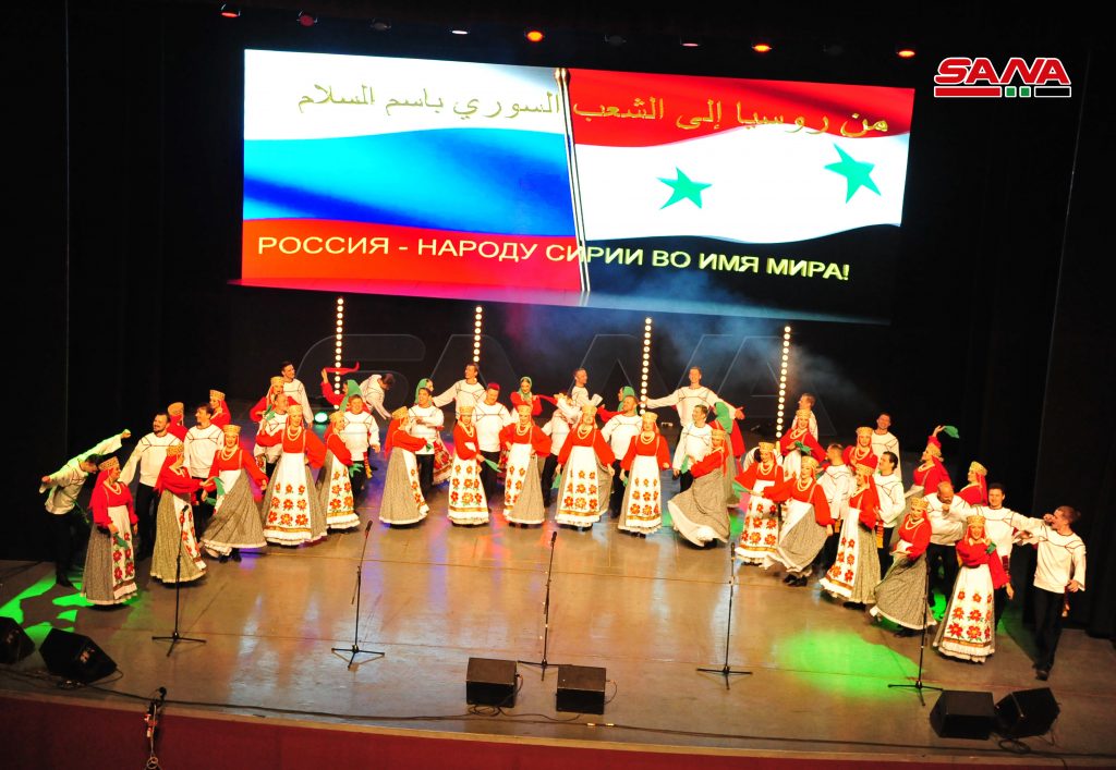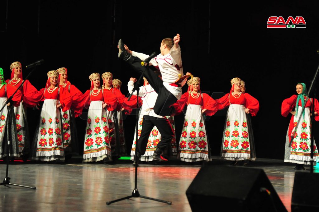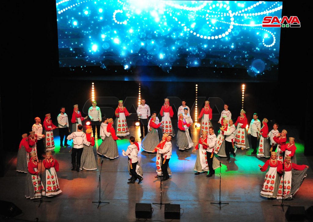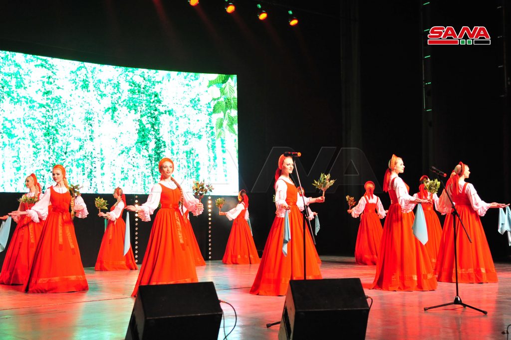 في إطار أيام الثقافة السورية والبرنامج الثقافي والإنساني “من روسيا إلى الشعب السوري معاً باسم السلام” نظمت وزارة الثقافة بالتعاون مع مكتب الرئيس الروسي وزارة الدفاع الروسية أمسية فنية راقصة للفرقة الموسيقية الأكاديمية بيريوزكا وجوقة بياتنسكي وذلك على مسرح الأوبرا بدار الأسد للثقافة والفنون.