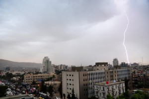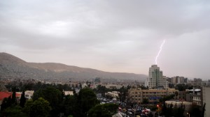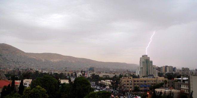 فقد شهدت العاصمة دمشق اليوم أمطارا مصحوبة بصواعق رعدية.