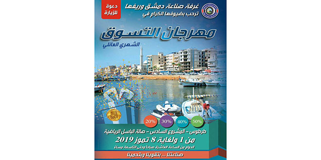 تنطلق يوم الاثنين المقبل في الصالة الرياضية بطرطوس فعاليات مهرجان التسوق الشهري “صنع في سورية” الذي تنظمه غرفة صناعة دمشق وريفها تحت عنوان “أهلاً بالصيف” ويستمر حتى الثامن من تموز القادم.