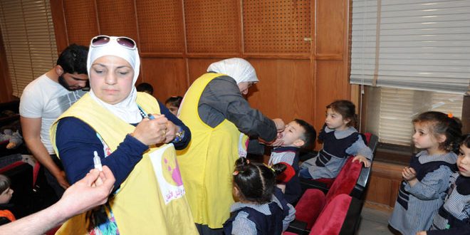 تواصل أيام التلقيح الوطنية فعالياتها لليوم الخامس في مدينة دمشق عبر المراكز الصحية والفرق الجوالة وحققت حسب القائمين عليها نسب تغطية جيدة وصلت لنحو 180 ألف طفل.