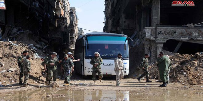 وأفاد مراسل سانا الحربي من على أطراف مخيم اليرموك بالانتهاء من تجهيز خمس حافلات تقل حوالي 200 من الإرهابيين وعائلاتهم وإخراجها إلى نقطة التجميع قرب دوار البطيخة بعد تفتيشها بشكل دقيق خشية تهريب الإرهابيين مفخخات وعبوات ناسفة داخل الأمتعة.