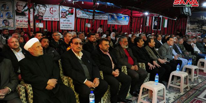 من جهته أكد عضو قيادة فرع فلسطين لحزب البعث العربي الاشتراكي طالب موسى أن المقاومة هي السبيل الوحيد لتحرير فلسطين موجها التحية إلى سورية ومحور المقاومة الذين يقفون مع الشعب الفلسطيني وقضيته.