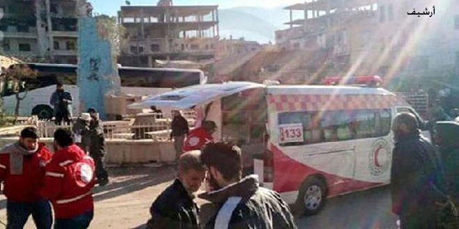 تم اليوم بإشراف الهلال الأحمر العربي السوري إخراج 6 أشخاص من بلدتي كفريا والفوعة المحاصرتين في ريف إدلب الشمالي وبلدة مضايا الواقعة في ريف دمشق والتي تتواجد فيها مجموعات إرهابية.