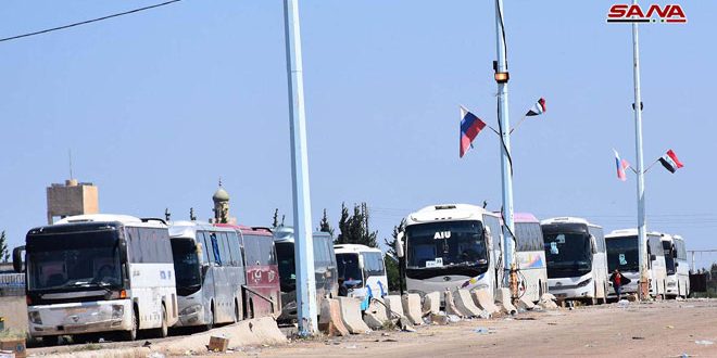 وتم أمس إخراج 122 حافلة تقل مئات الإرهابيين غير الراغبين بالتسوية وعائلاتهم من ريفي حمص الشمالي وحماة الجنوبي ونقلها إلى شمال سورية.