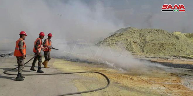 أخمد عناصر فرق الإطفاء بحمص اليوم حريقاً نشب بساحات تجمع مادة الكبريت في معمل السماد بحمص.