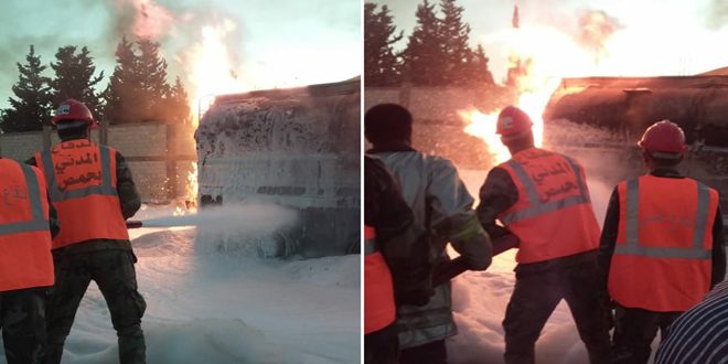 أخمد كوادر إطفاء حمص اليوم حريقاً اندلع في صهريج لنقل المحروقات في محطة وقود بحي دير بعلبة في مدينة حمص.