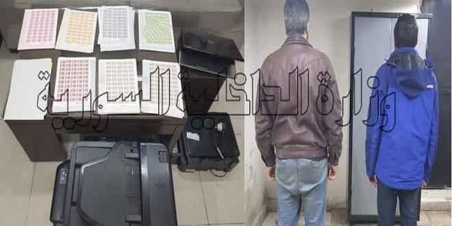 وأوضحت وزارة الداخلية في بيان تلقت سانا نسخة منه أنه بناء على المعلومات الواردة إلى إدارة الأمن الجنائي عن وجود طوابع مالية ولصاقات قضائية مزورة ومن خلال التحري قامت الإدارة بتوقيف شخصين من المتورطين ببيع وتزوير الطوابع واللصاقات ومصادرة عدد كبير منها وتم ضبط الأجهزة المستخدمة في عمليات التزوير.
