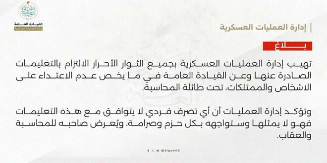 حذرت إدارة العمليات العسكرية من الاعتداء على الأشخاص والممتلكات تحت طائلة المسؤولية.