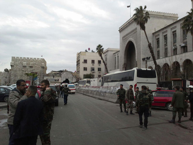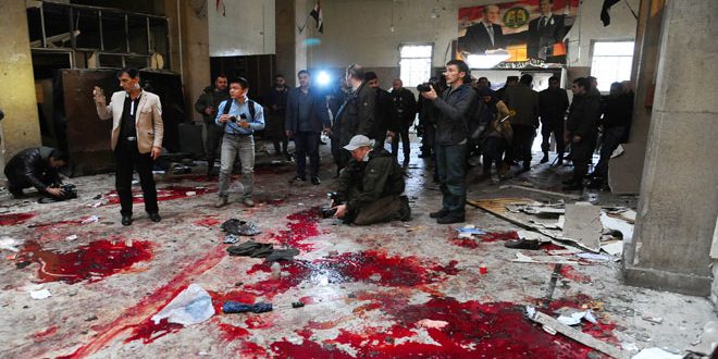 وذكر مصدر في قيادة شرطة دمشق لـ سانا “أن إرهابيا انتحاريا يرتدي حزاما ناسفا فجر نفسه ظهر اليوم في مبنى القصر العدلي بمنطقة الحميدية”.