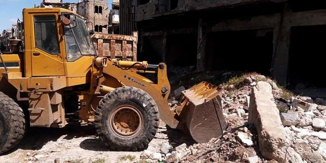 باشرت ورشات مجلس مدينة حمص أعمال إزالة الأنقاض وفتح كل الشوارع في حي كرم شمشم.
