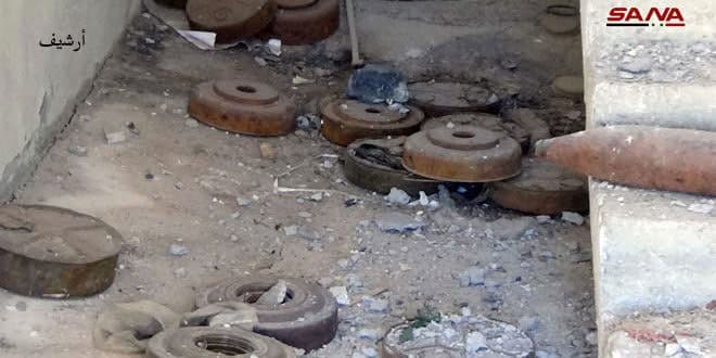 وعثرت وحدات من عناصر الهندسة خلال عملها الدؤوب منذ تحرير الجيش العربي السوري الغوطة في نيسان على مئات الأطنان من الذخائر والعبوات الناسفة والألغام كان الإرهابيون زرعوها في الأراضي الزراعية والمباني والطرقات ومنازل الأهالي.