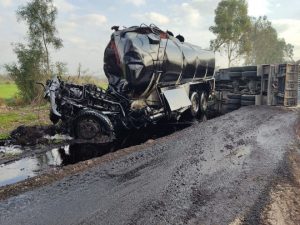 وذكر مصدر في فرع مرور حمص في تصريح لمراسل سانا أن سبب الحادث انفجار عجلات شاحنة مقطورة أدى لتدهورها واصطدامها بصهريجي نقل محروقات ما تسبب بتسرب المحروقات على الطريق.
