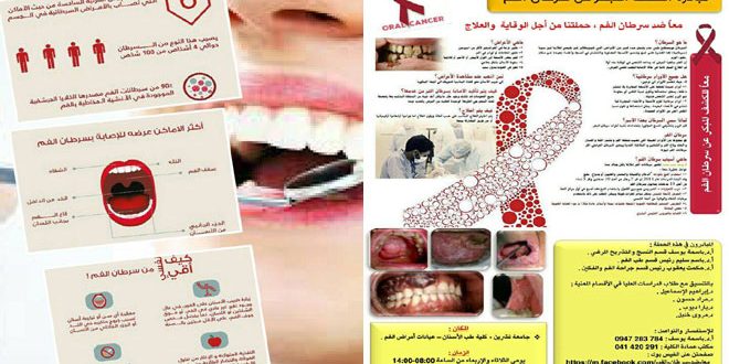 “معا ضد سرطان الفم” مبادرة تطوعية أطلقها أطباء وطلاب الدراسات العليا بكلية طب الأسنان في جامعة تشرين بهدف الكشف المبكر عن سرطانات الفم والحد من انتشارها.
