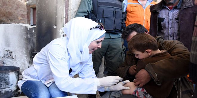 وأرسلت وزارة الصحة منذ إعلان تحرير بلدات الغوطة وتطهيرها من الارهاب بفضل بطولات الجيش العربي السوري كوادر متخصصة وعيادات متنقلة تقدم كل الخدمات الصحية للأهالي إضافة إلى تأمين اللقاحات اللازمة للأطفال بعد حرمانهم منها لسنوات بسبب سطوة التنظيمات الارهابية على بلدات الغوطة الشرقية.