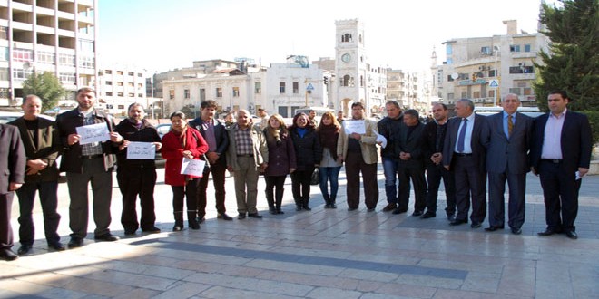 نفذ الإعلاميون والصحفيون العاملون في مختلف وسائل الإعلام المرئي والمسموع والمقروء في محافظة حماة وقفة تضامنية أمام مبنى الأمانة العامة للمحافظة دعما لقناة المنار اللبنانية على خلفية إيقاف بثها على القمر الصناعي “عرب سات” مؤكدين ان المنار هي المنبر المعبر عن تيار المقاومة بأسمى معانيه.