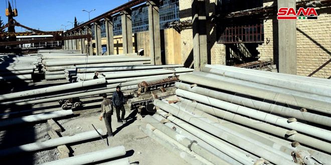 بدوره أوضح المهندس حسام الغزالي مدير المعمل أن إنتاج الأعمدة يمر بثلاث مراحل الأولى تشمل تحضير الأسلاك وتركيبها على خطوط الإنتاج ثم شدها ولفها بشكل حلزوني ومن ثم مرحلة صب البيتون من خلال المجبل المركزي وتتم تغطية الأعمدة قبل بدء عملية التدوير ليأخذ العمود شكله الإهليلجي ويفرغ من الداخل وبعدها تبدأ مرحلة معالجة الأعمدة بالبخار بواسطة الأفران.