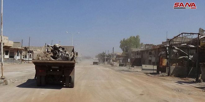 تتابع الورشات الفنية المتخصصة في مختلف القطاعات الخدمية في مدينة درعا وريفها أعمالها لإزالة آثار الإرهاب وإعادة الخدمات الأساسية للأهالي ووصلت في بعض القطاعات إلى نسبة تنفيذ تفوق الـ 60 بالمئة وخاصة في مجال الاتصالات وفتح الطرقات وترحيل الأنقاض وإصلاح الشبكات الكهربائية وغيرها تمهيدا لإعادة الحياة الطبيعية إلى ربوع المحافظة التي تشكل درة منطقة حوران وإحدى سلال سورية الغذائية.