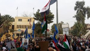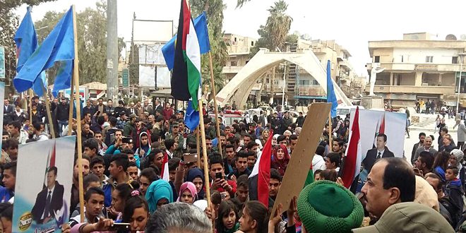حيت جماهير محافظة الحسكة اليوم بطولات الجيش العربي السوري وانتصاراته المتتالية والتي توجت قبل يومين تطهير مدينة البوكمال بالريف الشرقي لدير الزور من إرهابيي “داعش”.