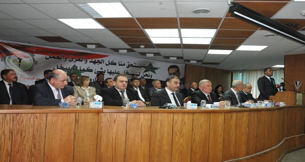وفي كلمة لمحمد شعبان عزوز عضو القيادة القطرية رئيس مكتب العمال القطري نوه بجهود العمال والفلاحين و”كل من أسهم في بناء هذا الصرح العظيم الوطني الذي يضم الطبقة العاملة والمتمثل بالاتحاد العام لنقابات العمال الذي حافظ على حقوقهم وزاد من مكاسبهم”.