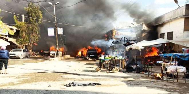 وأفادت مصادر محلية لمراسل سانا بأن صهريجاً مفخخاً بكمية كبيرة من المتفجرات انفجر أمام مقر لمرتزقة النظام التركي في أحد الأسواق وسط المدينة ما أدى إلى مقتل عدد من الإرهابيين واصابة آخرين بجروح إضافة إلى استشهاد وجرح عدد من المدنيين وإحداث دمار كبير في المكان.