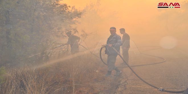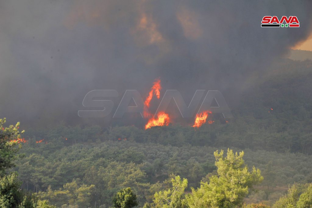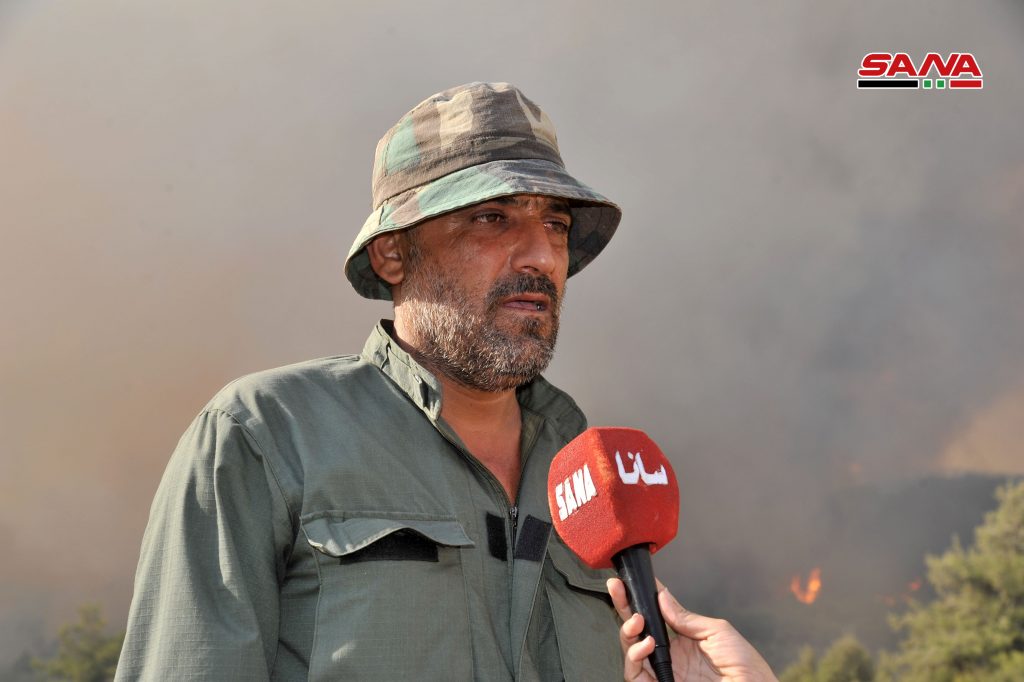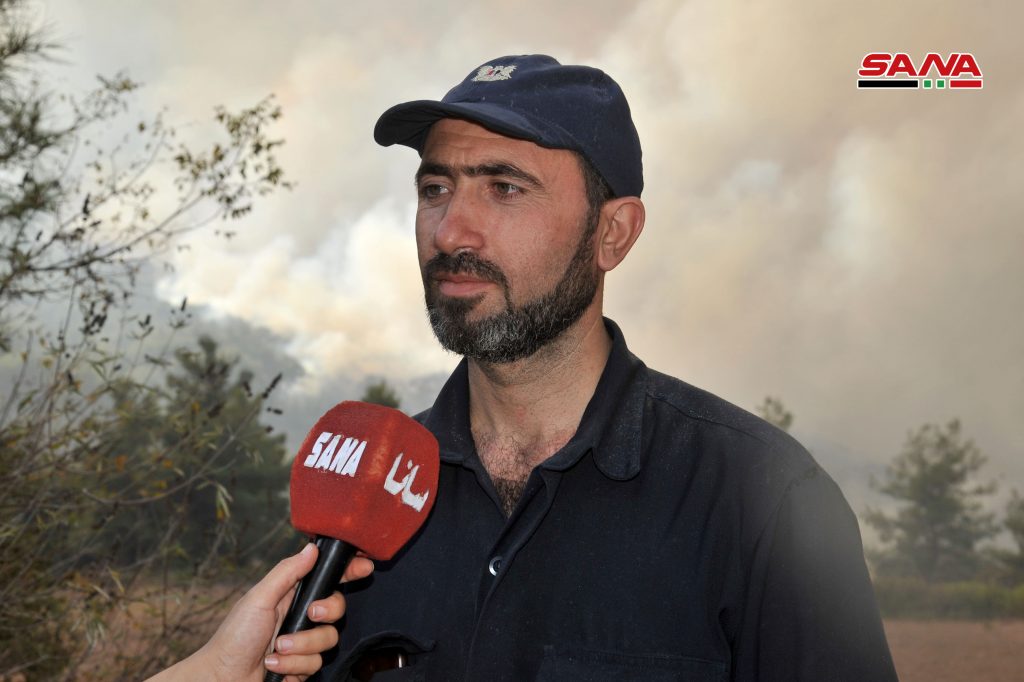 إبراهيم البحري سائق إطفائية من دائرة الحراج بمديرية الزراعة في اللاذقية أوضح أن الرياح التي تجاوزت سرعتها 50 كم-سا لعبت دوراً كبيراً في تسارع رقعة الحريق الذي أتى على مساحات حراجية كبيرة مروراً بقرى العيسوية والضحى والفجر التي لم تعد مرئية للعيان بسبب الدخان وألسنة اللهب القوية ونحن هنا بالتعاون مع الأهالي وبمؤازرة من فوج إطفاء حماة نسعى جاهدين إلى وقف زحف النيران.