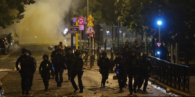 ونشرت فرنسا 45 ألف شرطي ودركي مدعومين بآليات مدرعة لقمع الاحتجاجات التي اندلعت إثر مقتل فتى يبلغ من العمر 17 عاماً برصاص شرطي، خلال تدقيق مروري في إحدى ضواحي باريس يوم الثلاثاء الماضي، ما أدى إلى اندلاع مظاهرات غاضبة تخللتها أعمال شغب وإحراق العديد من السيارات احتجاجاً على إطلاق الشرطة الغاز المسيل للدموع، وتنفيذها حملة اعتقالات ضد المتظاهرين.