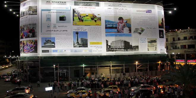 افتتاح وإنارة أضواء الجريدة الإعلانية العملاقة على واجهات فندق سميراميس بدمشق