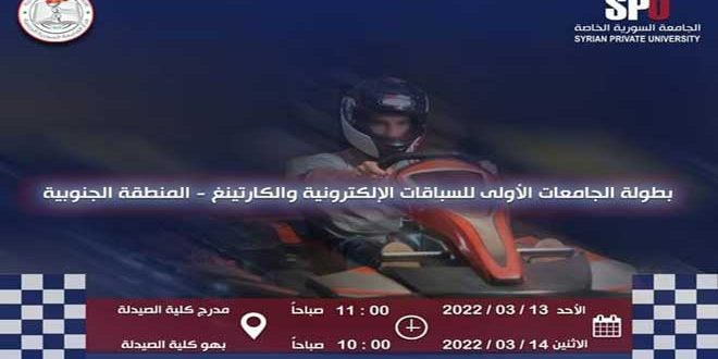 يفتتح نادي السيارات السوري موسمه الجديد بإقامة السباق الأول من بطولة الجامعات الأولى للسباقات الالكترونية والكارتينغ للمنطقة الجنوبية يومي 13و 14 آذار الجاري.