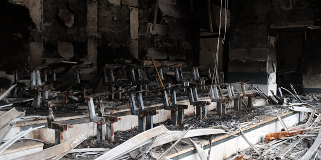 الأضرار المادية الكبيرة التي لحقت باستاد حلب الدولي إثر الحريق المفتعل الذي اندلع قبل أيام 2024-12-24