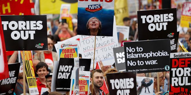 تظاهر آلاف الأشخاص في شوارع لندن احتجاجا على تدابير التقشف التي اتخذتها حكومة رئيسة الوزراء تيريزا ماي معتبرين أن ماي خسرت أي شرعية بعد النكسة التي لحقت بها في الإنتخابات التشريعية في 8 حزيران الماضي.