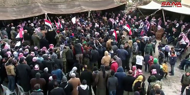 الأهالي والفعاليات الاجتماعية ووجهاء العشائر المشاركون في التجمعين رفعوا أعلام الوطن وصور السيد الرئيس بشار الأسد ورددوا هتافات تمجد بطولات الجيش العربي السوري وتؤكد على اللحمة الوطنية التي كان لها الأثر الكبير في صمود السوريين بوجه التنظيمات الإرهابية وظلامية فكرها وإجرامها.