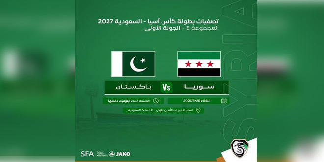 ثبت الاتحاد الآسيوي لكرة القدم موعد ومكان المباراة الافتتاحية لمنتخب سوريا الوطني الأول في تصفيات كأس آسيا 2027 أمام منتخب باكستان بعد رفع عقوبة التجميد عن الاتحاد الباكستاني.