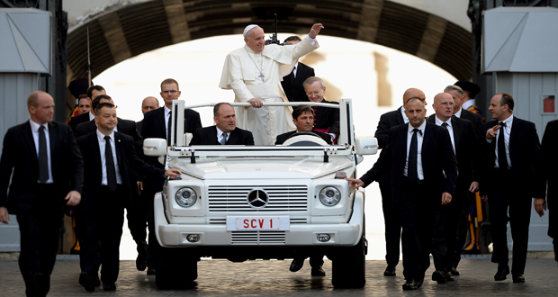 البابا فرانسيس يحيي الحشود المجتمعه من أجل "المقابلة العامة الأسبوعية" في ساحة القديس بطرس في الفاتيكان