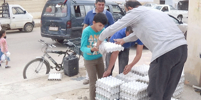 وأوضح المهندس فريد السويدان مدير فرع مؤسسة الخزن والتسويق بدرعا أن المؤسسة بالتعاون مع مديرية التجارة الداخلية تعمل على التدخل أسبوعيا في أسعار البيض إذ يتم طرحه في صالات المؤسسة ب 940 ليرة للطبق مقارنة ب 1100 في الأسواق و ذلك بهدف توفير المادة للمواطن وبسعر أقل من السوق لكسر ارتفاع الأسعار.