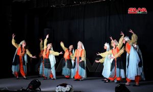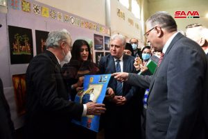 وفي السياق اطلع وزير التربية على المعرض الفني المقام بمقر دائرة المسرح المدرسي والذي تضمن أعمالا فنية متنوعة ورسومات للطلبة والتلاميذ في دوائر المسرح المدرسي بمدارس حمص فيما قدمت فرقة الفنون الشعبية في دائرة المسرح فقرة فلكلورية راقصة على أنغام أغان وطنية.