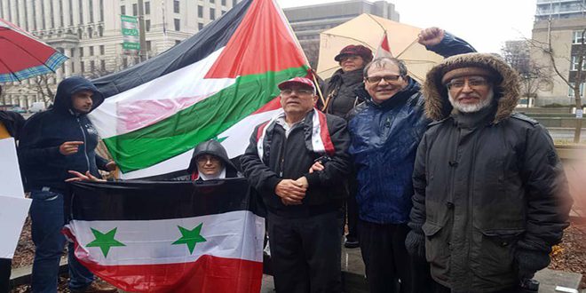 ندد أبناء الجالية السورية في كندا خلال وقفة احتجاجية أمام القنصلية الأمريكية في تورنتو بإعلان الرئيس الأمريكي دونالد ترامب حول اعتبار الجولان السوري المحتل تابعا لكيان الاحتلال الإسرائيلي.