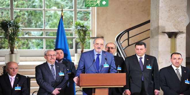 وجدد الجعفري التأكيد على أن وفد الجمهورية العربية السورية جاء إلى جنيف بحس عال من المسؤولية وبتعليمات من القيادة والحكومة للانخراط إيجابيا وبشكل مسؤول ومثمر ومفيد في الحوار السوري السوري من دون تدخل خارجي ودون شروط مسبقة.