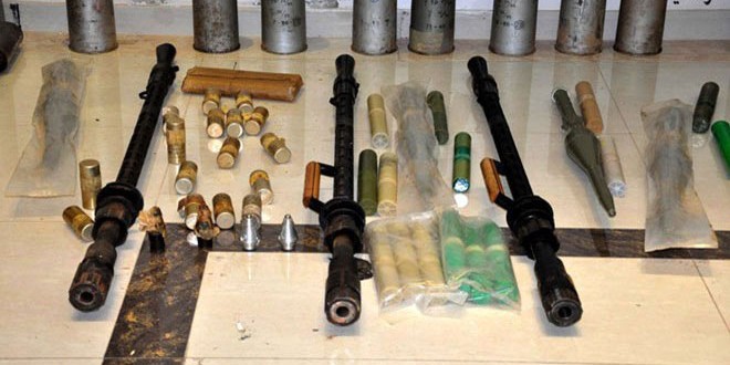 وأفاد مصدر في المحافظة لمراسل سانا بأن الجهات المختصة ضبطت كميات من الأسلحة والعبوات الناسفة والمواد المتفجرة كانت مخبأة ضمن وكر في أحد منازل الإرهابيين في حي الفراي بمدينة حماة.