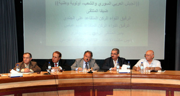 وقدم اللواء الركن المتقاعد علي الجندي نبذة تاريخية عن تأسيس الجيش العربي السوري مرورا بأهم المحطات الوطنية وصولا للمرحلة الحالية التي تعتبر معركة دفاع عن الوجود بينما تحدث اللواء الركن المتقاعد نديم عباس عن التاريخ العسكري للجيش العربي السوري والمعارك الأكثر أهمية التي خاضها ضد المستعمرين العثماني والفرنسي ثم على أرض فلسطين.