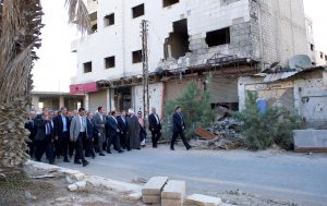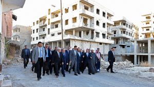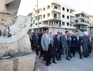 وفي أعقاب الصلاة قام الرئيس الأسد وصحبه بجولة في عدد من شوارع المدينة التي تعرضت لعمليات تخريب ممنهج من قبل التنظيمات الإرهابية شملت دور العبادة والبنى التحتية والممتلكات العامة والخاصة.