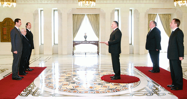 حضر مراسم تقديم أوراق الاعتماد وليد المعلم نائب رئيس مجلس الوزراء وزير الخارجية والمغتربين ومنصور عزام وزير شؤون رئاسة الجمهورية.